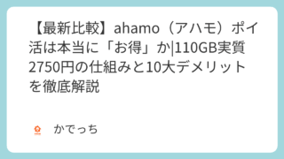 スマホ・格安SIM 【最新比較】ahamo(アハモ)ポイ活は本当に「お得」か|110GB実質2750円の仕組みと10大デメリットを徹底解説 こんにちは、かでよです。スマートフォン料金を抑えたいけど、ギガもポイントも気になるあなたへ。ドコモが提供する「ahamo ポイ活」は、月額7,150円で110GBを実質2,750円に抑えられると話題ですが、本当にお得なのでしょうか。多くのユ... 2025.10.18 スマホ・格安SIM