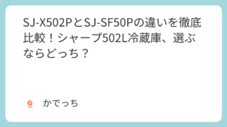 悩める人シャープの502L冷蔵庫でSJ-X502PとSJ-SF50Pって似てるけど、何が違うの?かでっちこんにちは!家電好きブロガーのかでっちです。シャープの同じ502L・幅68.5cmのフレンチドア冷蔵庫、【SJ-X502P】と【SJ-S...